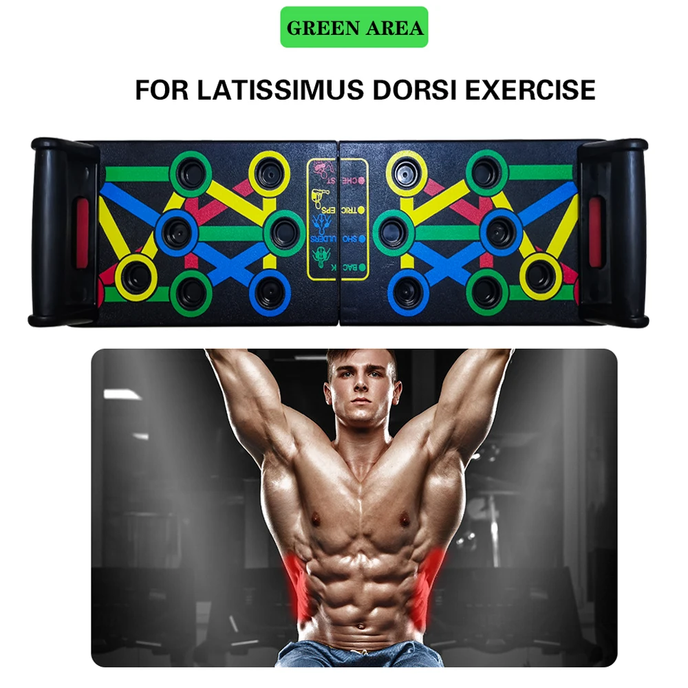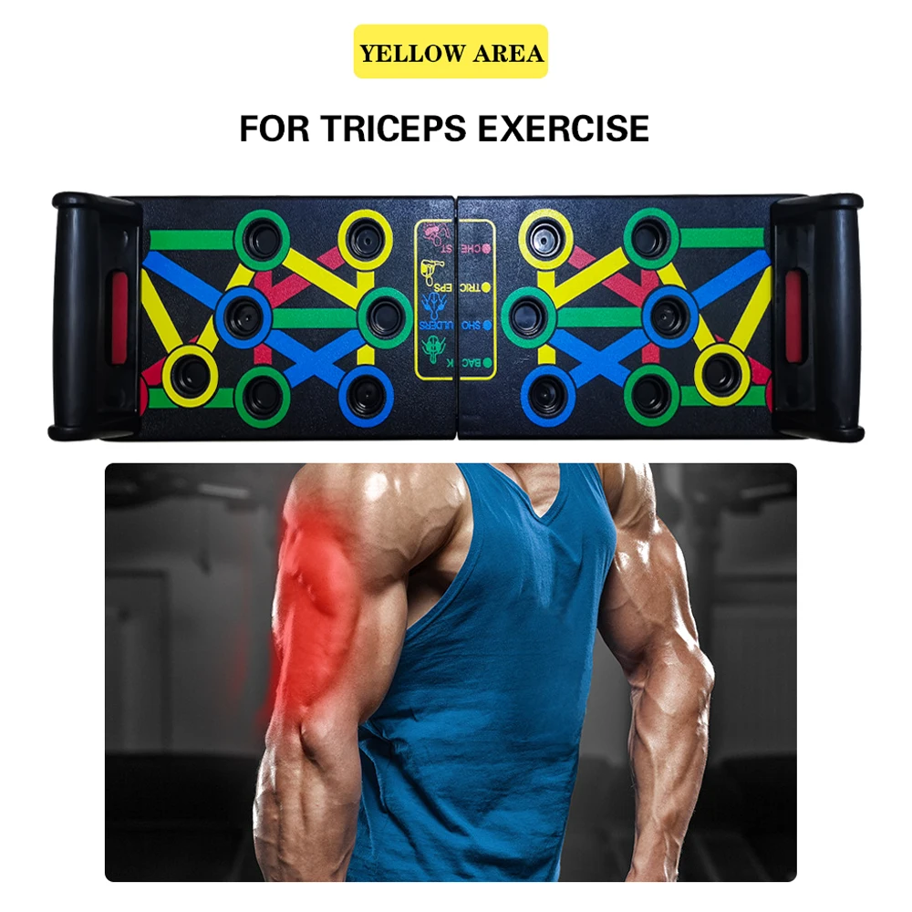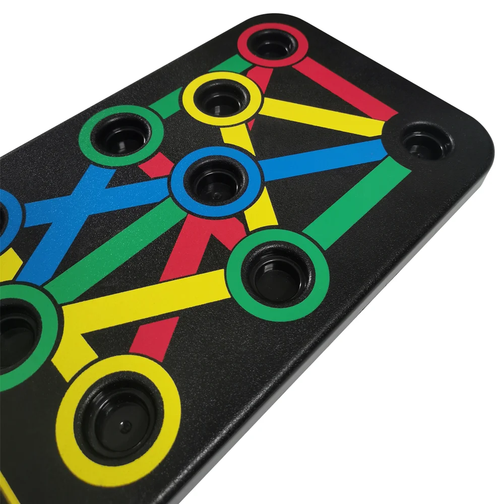 Multifunction Push Up Rack Board This Push Up Rack Board is a Comprehensive push up training system that color-coded. Different colors targets different exercise muscle part(Blue-chest, Red-shoulders, Yellow-back, and Green-triceps)