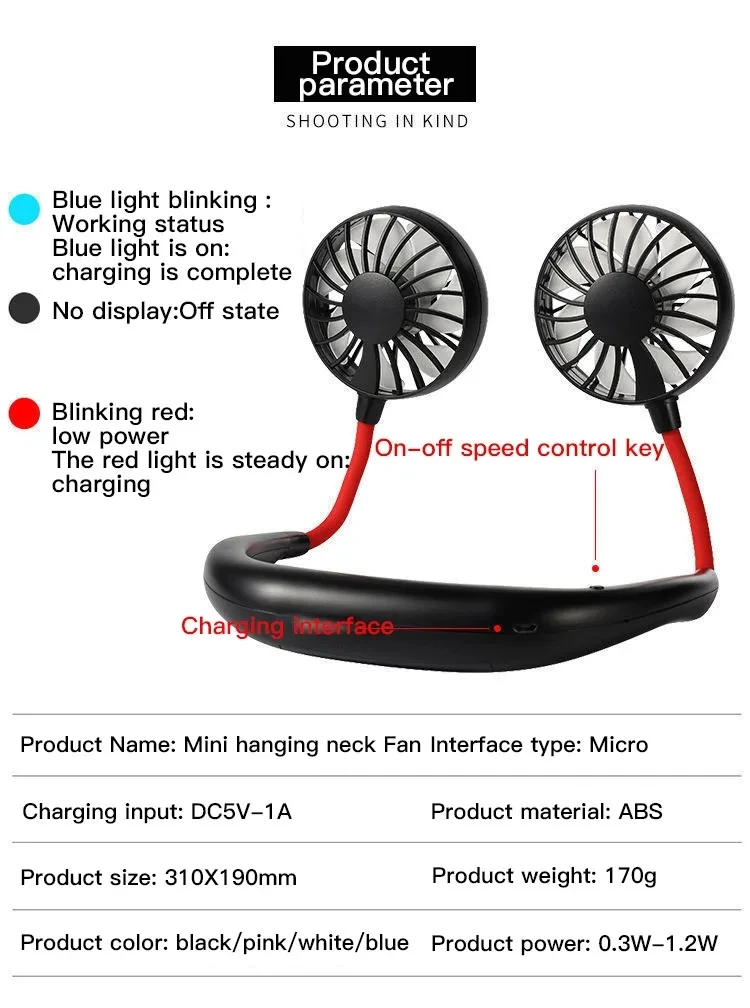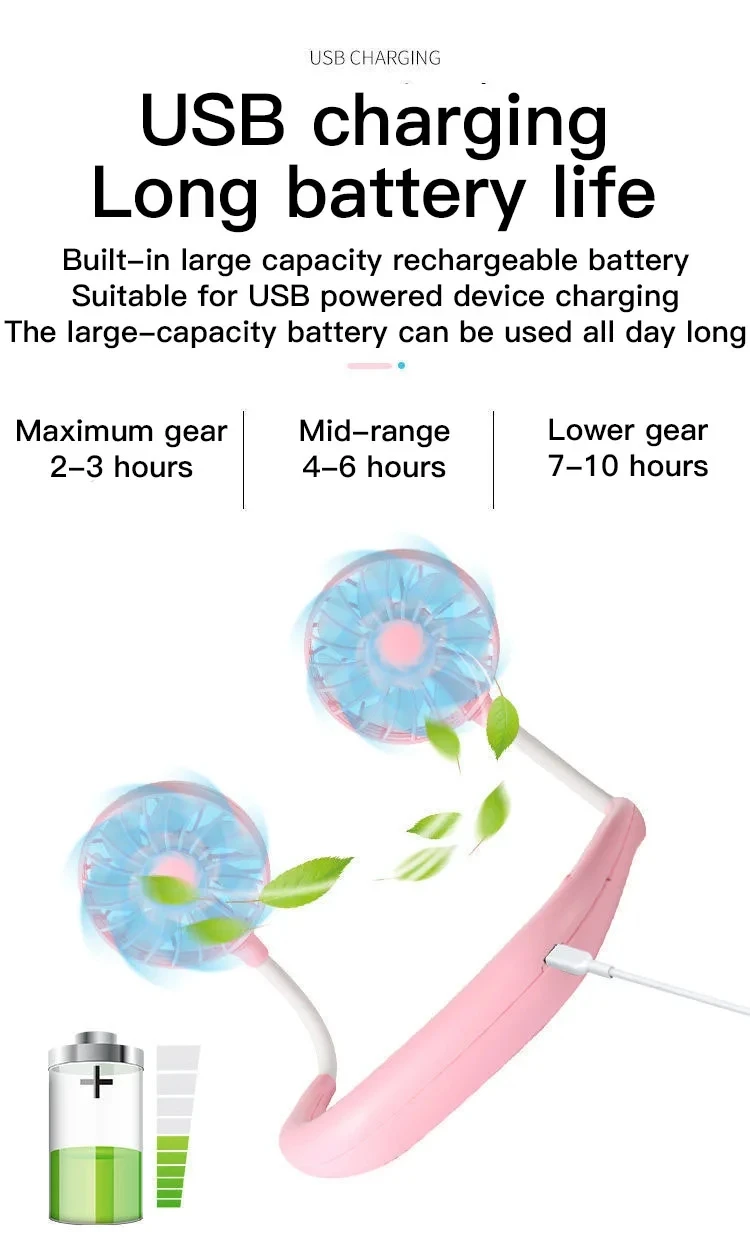 • Neck Hanging Design: The fan can be easily hung around the neck for hands-free use.